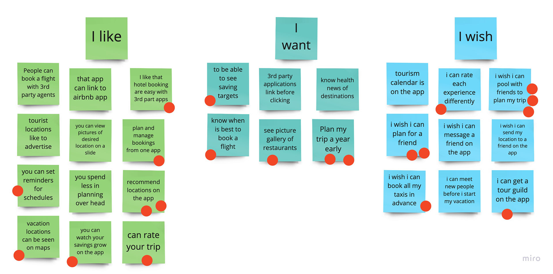 Dot Voting in Ideation, Identifying the concerns of what the user LIKE, WANT, and WISH is followed by voting on the priorities that users resonate with, that way we put the red dot, and the majority wins. The ones selected as a majority are plotted to determine how easy they are to implement or design.